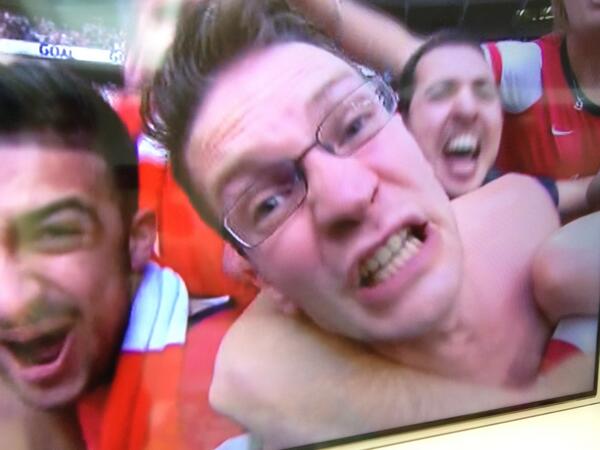wachezaji wa Arsenal wakishangilia goli la ramsey.