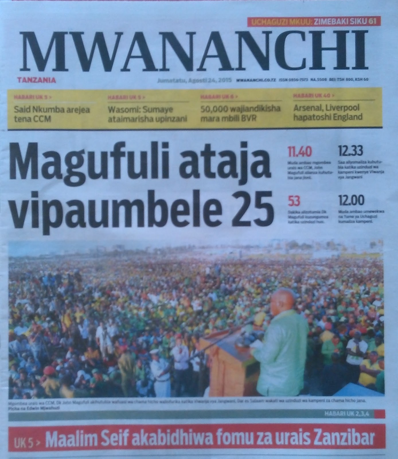 Habari Zilizopo Katika Magazeti ya Leo Jumatatu ya Tarehe 24 August 2015 A+ A- Print Email Je, Una Habari,Picha,Tangazo,Makala, Hifadhi blog hii kwenye simu yako ili upate habari zote kwa urahisi zaidi Facebook Blogger Plugin by Kibonajoro